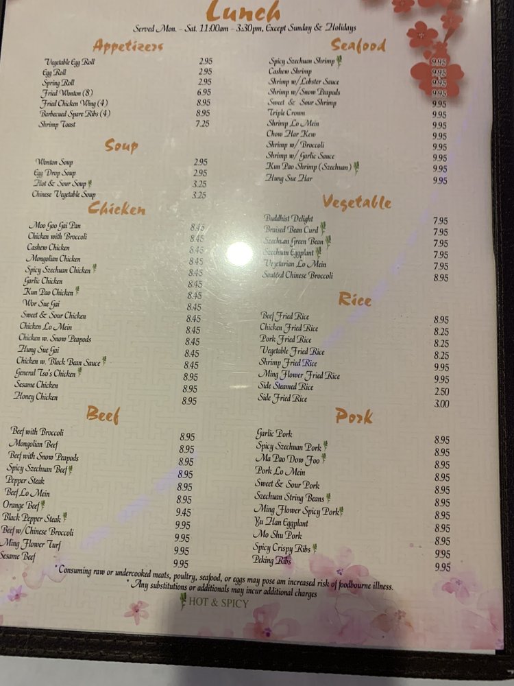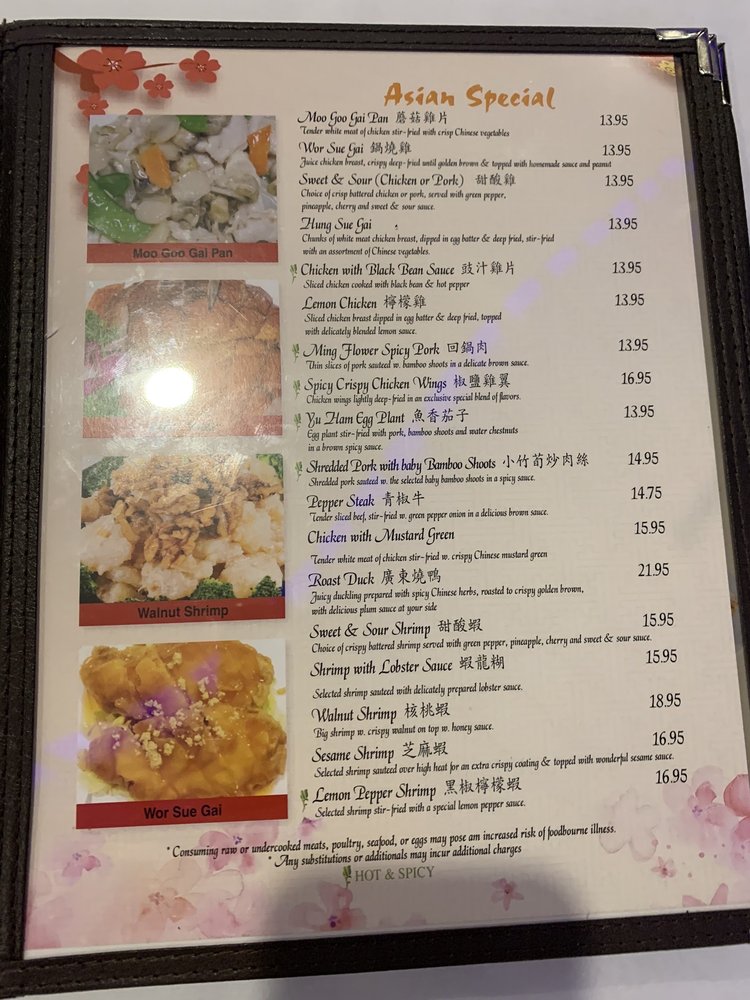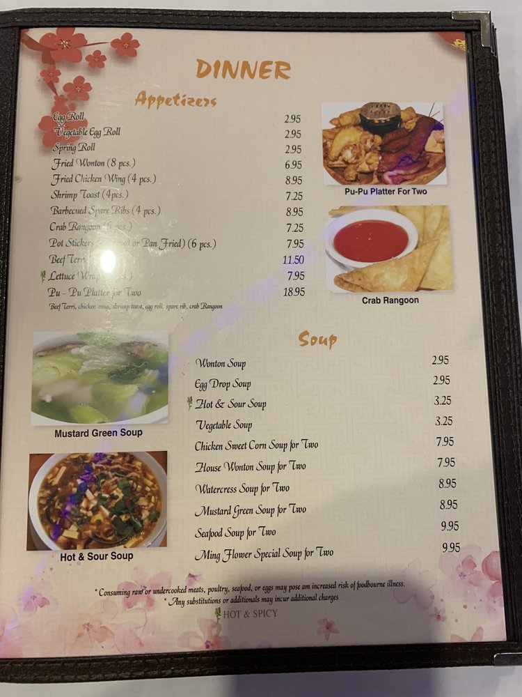 Ming Flower Chinese Restaurant in Westerville, OH, offers a variety of Chinese dishes in a casual and quiet setting. With options for delivery, takeout, and catering, Ming Flower caters to various dining preferences. The menu features appetizers like egg rolls and shrimp toast, soups like wonton and hot and sour, and dinner options ranging from chicken to scallops. Customers rave about the friendly service and tasty, reasonably priced food. Standout dishes include the Ming Flower Spicy Pork, which offers a flavorful kick, and the beef terri with a unique presentation. The restaurant's ambiance combines modern and traditional elements, creating a pleasant dining experience. For those looking for authentic Chinese cuisine, Ming Flower is a must-visit spot in Westerville.